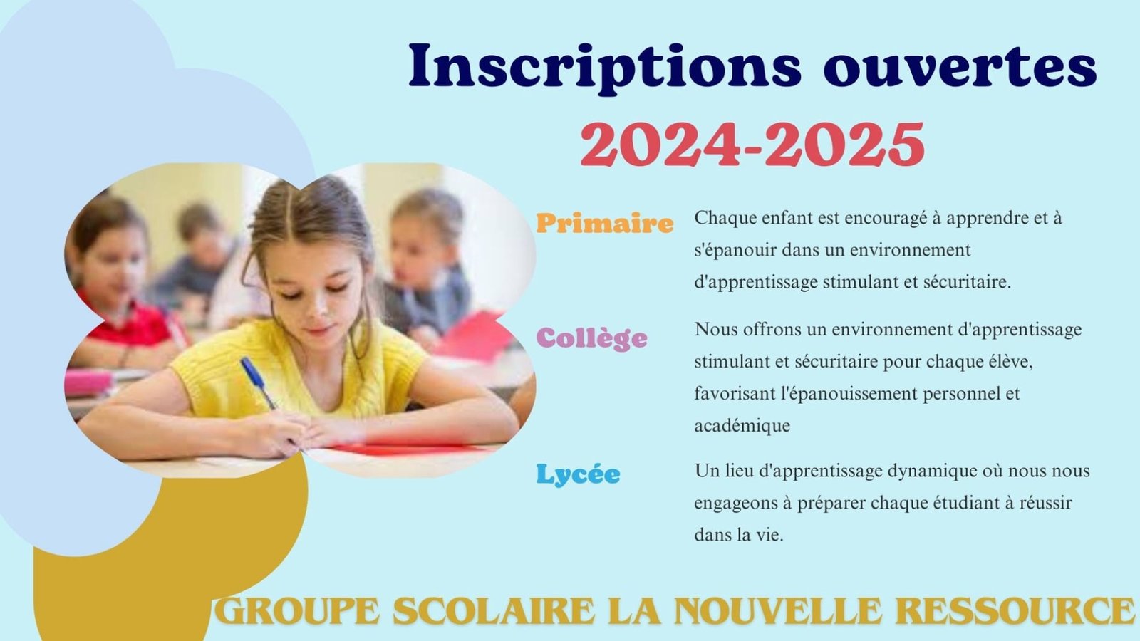 Bienvenue au Groupe Scolaire LA NOUVELLE RESSOURCE.